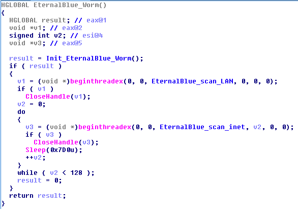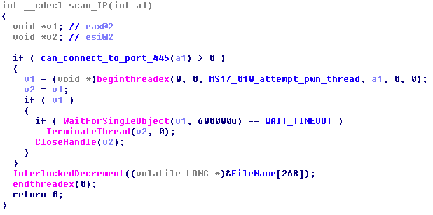 Los hilos que exploran Internet generan una dirección IP aleatoria utilizando el generador de números pseudoaleatorios criptográficamente seguro del sistema operativo inicializado anteriormente, o un generador de números pseudoaleatorios más débil si el CSPRNG no se inicializa. Si la conexión al puerto 445 en esa dirección IP aleatoria tiene éxito, se analiza todo el rango / 24 y si el puerto 445 está abierto, se realizan intentos de explotar. Esta vez, el tiempo de espera de explotación para cada IP no ocurre después de 10 minutos, sino después de una hora.