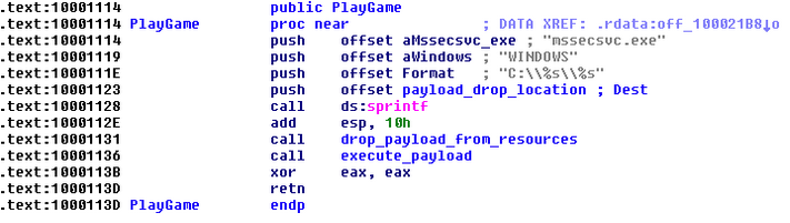 El código de cada DLL de la carga útil es muy pequeño, sólo obtiene el contenido del recurso (es decir, el gusano binario), cayendo al disco como C: \ WINDOWS \ mssecsvc.exe (esta ruta es realmente codificada) y ejecutándolo.