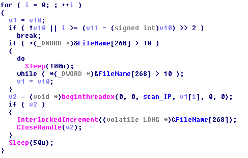 Después de inicializar la funcionalidad utilizada por el gusano, se crean dos subprocesos. El primer hilo escanea los hosts en la LAN. El segundo hilo se crea 128 veces y escanea hosts en Internet.